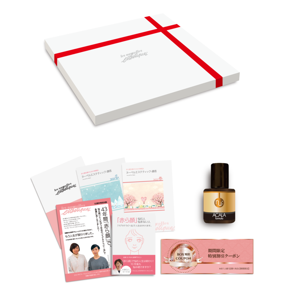 ・赤ら顔専用高濃度美容液(1週間相当分10ml)・「赤ら顔悩む人悩まない人」書籍(代表木村映麻著)・赤ら顔改善のための季刊誌・体験者のインタビュー誌・マグネテラピー法パンフレット・クーポン