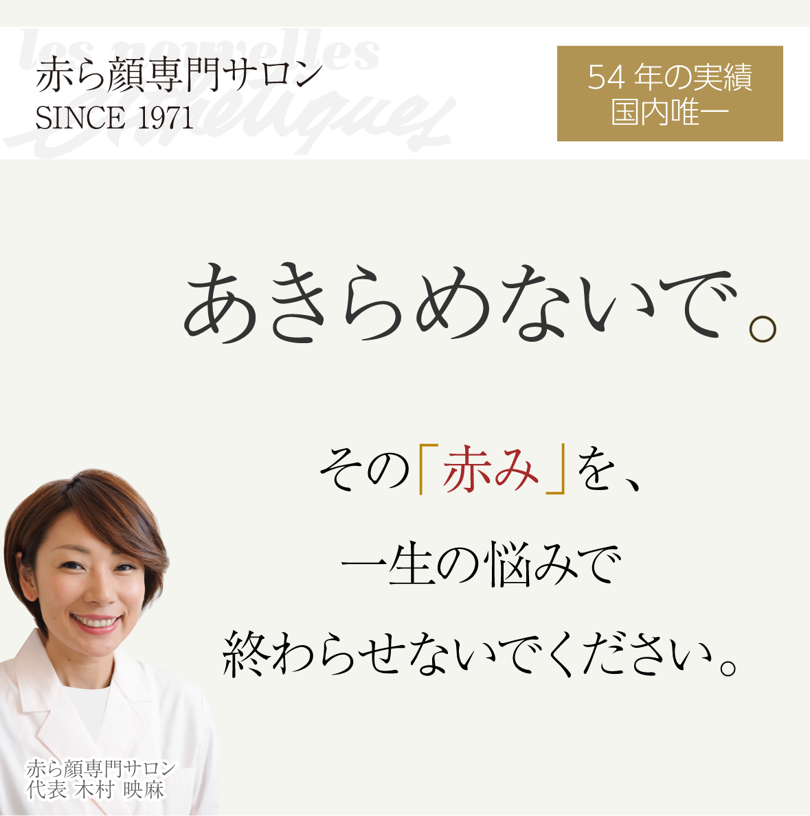 そんなお悩みを持つ方々の最後の砦として、私たちは54年の歳月を赤ら顔の改善だけに捧げてきました。